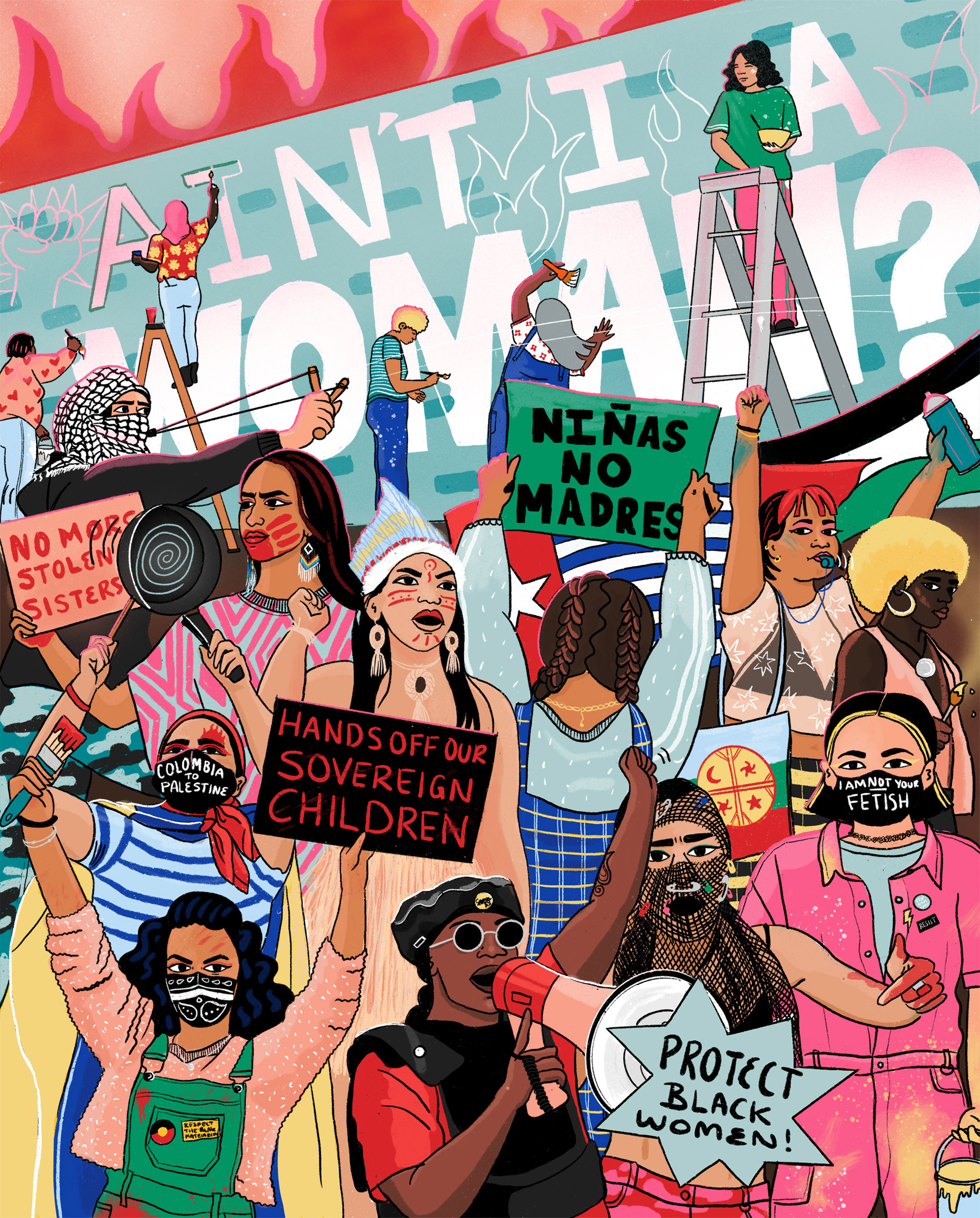 Creativity is an outlet for many and the women shown here are artists and creatives, alluded to by their attire, paintbrushes and paint in hand with their signs and mural in the background, tying the piece together, asking “Ain’t I A Woman?”